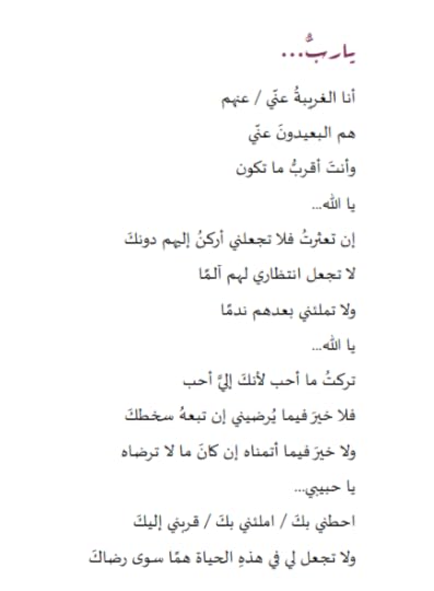 يارب ... أنا الغريبة عني /عنهم هم البعيدون عني وأنت أقرب ما يكون يا الله .... إن تعثرت فﻻ تجعلني أركن إليهم دونك ﻻ تجعل إنتظاري لهم ألما وﻻ تملئني بعدهم ندما يا الله..