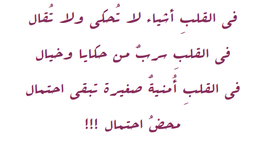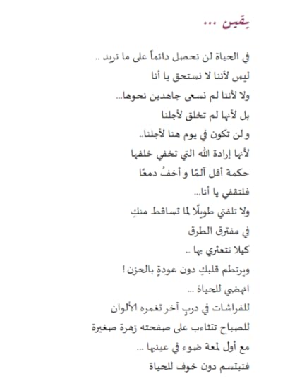 قصاصاتُ كثيرة وكلماتٌ من حُبٍ و أملٍ/ و حياة قصاصاتٌ ملونة و الكثيرُ من العباراتِ الملونة بالفَرح / بالصبر وضعتها في عُلبةٍ صغيرة كل يوم تتناول قهوتها قُرب الضوء باطمئنان .. تمررُ أناملها عبر العلبة و تلتقط قُصاصة .. تقرأها لنفسها و تبتسم تمنحُ قلبها وعداً بألا يذبل :::