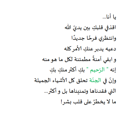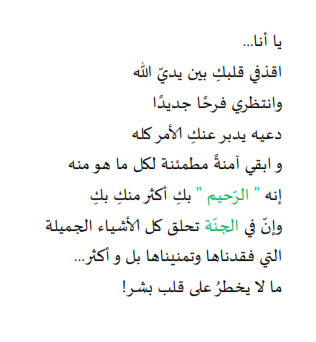 مع أول تكبيرة للحياة كيفما تصبر المؤمنات كانت .. كان صبرها كان إيمانها/يقينها بالله وكانت روحها مترفة بالأمل و الرضا وغدا لمثلها تركض الأمنيات لمثلها تشتاق الجنة