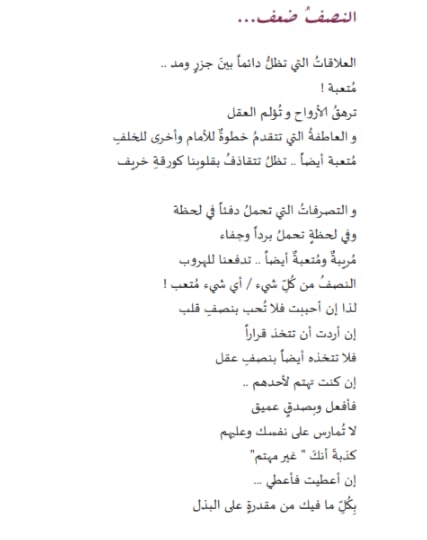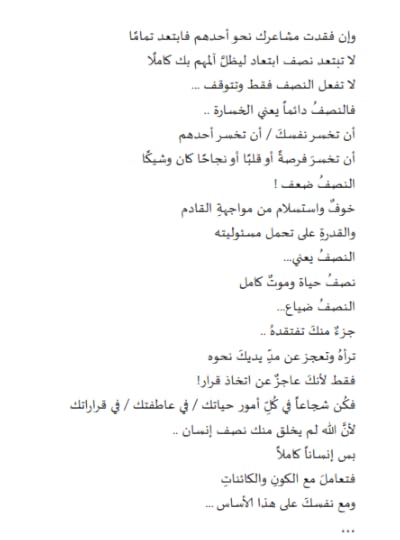 من الكتب المميزه اللى قرأتها اسلوب الكاتبه رائع فعلا واجمل ما قرأت فيه هو: إن أحببت فلا تحب بنصف قلب وان اردت أن تأخذ قراراً فلا تأخذه أيضا بنصف عقل ان كنت تهتم لآحدهم فأفعل وبصدق عميق لا تمارس على نفسك وعلهم كذبه انك غير مهتم أن أعطيت فأعطى بكل ما فيك من مقدره على البذل وان فقدت مشاعرك نحو أحدهم فأبتعد تماماً لا تبتعد نصف ابتعاد ليبقى ألمهم بك كاملاُ لا تفعل النصف فقط وتتوقف فالنصف دائما يعنى الخساره أن تخسر نفسك أن تخسر احدهم ان تخسرفرصه او قلباً او نجاحا كان وشيكا فالنصف دائما يعنى ضعف