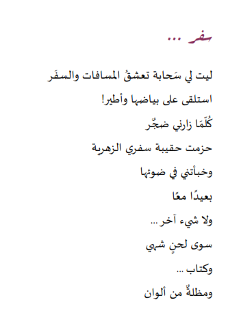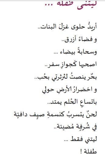 هي تشتاقُ للفرح تحملُ في أحشائها حُزنًا ترفضُ مشاركته معهم وفي حقيبتها دائمًا ثمّة دفتر صغير بلونِ البهجة ترسمُ عليه فرحتها المرتقبة ولا تمل .. لا تملُ الانتظار