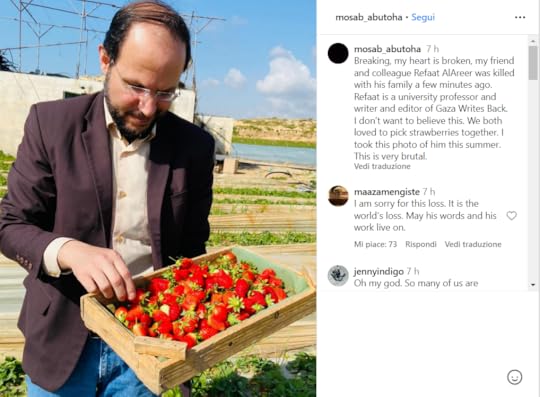 Israel murdered Refaat Alareer today, along with his sister and her family, in a targeted missile attack on her home. He was, by all accounts, a sweet, intelligent man; he loved collecting strawberries. He was also a giant in Gaza's field of scholarship and intellectualism, someone who rose despite aggression and persecution.
