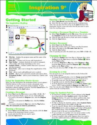 Do you need an easy-to-follow software reference right at your fingertips? Our 6 page, tri-fold guides are the answer. These quick reference guides include step by step instructions to help users to learn software features more quickly, as well as full color screen graphics to highlight important features. Quick Source reference guides also include the software programs NEW features and gives you quick access to time saving shortcuts. The Inspiration 9 Quick Source guide is a clear and concise tool for learning the features in Inspiration 9. Features contained in this guide include Creating and Working with Documents, Using the Symbols Palette, Working with Symbols, Working with Text, Working in the Diagram, Outline, and Map View, Proofing a Document, Working with the Presentation Manager, and much more.