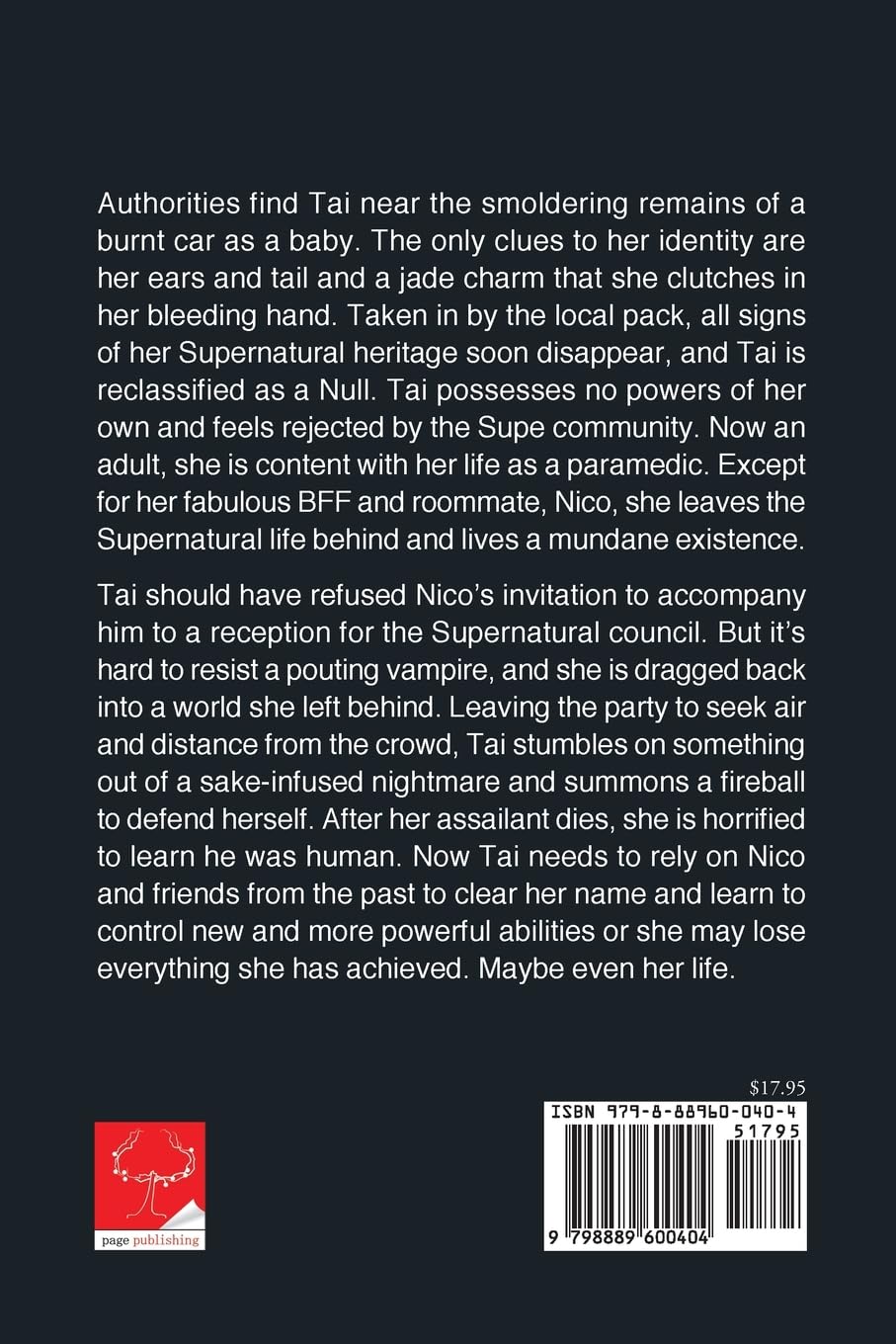 Authorities find Tai near the smoldering remains of a burnt car as a baby. The only clues to her identity are her ears and tail and a jade charm that she clutches in her bleeding hand. Taken in by the local pack, all signs of her Supernatural heritage soon disappear, and Tai is reclassified as a Null. Tai possesses no powers of her own and feels rejected by the Supe community. Now an adult, she is content with her life as a paramedic. Except for her fabulous BFF and roommate, Nico, she leaves the Supernatural life behind and lives a mundane existence. Tai should have refused Nico's invitation to accompany him to a reception for the Supernatural council. But it's hard to resist a pouting vampire, and she is dragged back into a world she left behind. Leaving the party to seek air and distance from the crowd, Tai stumbles on something out of a sake-infused nightmare and summons a fireball to defend herself. After her assailant dies, she is horrified to learn he was human. Now Tai needs to rely on Nico and friends from the past to clear her name and learn to control new and more powerful abilities or she may lose everything she has achieved. Maybe even her life.