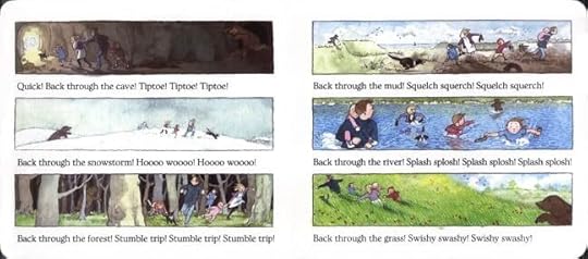 After undergoing each adventure, the family at last end up in ‘gloomy cave’ where they come face to face with none other than the bear himself! Quick! They must rapidly go back through each setting, creating an element of excitement and rush. If reading this book out loud with a class, the teacher can pause here and ask children to recall the adventures the characters went through in the correct order from the most recent.