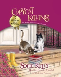 I don't have a lot to say about Copycat Killing that I didn't say about Curiosity Thrilled the Cat or Sleight of Paw. This was another "Magical Cats" mystery, complete with librarian Kathleen Paulson, her cats with seemingly magical abilities, Owen and Hercules, and her friends living in small-town Minnesota. This time around, there were two murders in the town: a local artist was murdered, and it turns out that the remains of a long-missing town member was also found. As the series has evolved, author Sofie Kelly has gotten better at writing her mysteries. In the first novel, it was pretty obvious what was going on from a very early part in the book. Now in the third book in the series, there seems to be more development of the mystery, and things aren't quite as obvious early-on. As a side note, if I were a person living in this town, I'd move out--it's had a lot of murders in just over a year!!!! :D