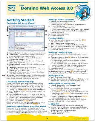 Do you need an easy-to-follow software reference right at your fingertips? Our 6 page, tri-fold guides are the answer. These quick reference guides include step by step instructions to help users to learn software features more quickly, as well as full color screen graphics to highlight important features. Quick Source reference guides also include the software program s NEW features and gives you quick access to time saving shortcuts. The Lotus Domino Web Access Quick Source guide is a clear and concise tool for learning the features in Domino Web Access 8.0. Feature contained in this guide include NEW features such as Using the Preview Pane. It also includes Customizing the Welcome Page, Creating a Folder, Viewing Mail, Replying to a Message, Creating Stationery, Changing Calendar Views, Creating a Contact, Creating a Notebook Page, Setting a Repeating Calendar, Event or To Do Item, and much more.