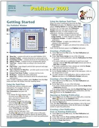 Do you need an easy-to-follow software reference right at your fingertips? Our 6 page, tri-fold guides are the answer. These quick reference guides include step by step instructions to help users to learn software features more quickly, as well as full color screen graphics to highlight important features. Quick Source reference guides also include the software program s NEW features and gives you quick access to time saving shortcuts. The Microsoft Publisher 2003 Quick Source guide is a clear and concise tool for learning the features in Publisher 2003. Features contained in this guide include NEW features such as Creating a Web Site, Using the E-Mail Wizard, Using the Research Task Pane, and Using the Publisher Help Task Pane. It also includes Creating a Publication, Entering Text, Using the Objects Toolbar, Applying a Color Scheme, Creating a Table, Using Pack and Go, and much more.