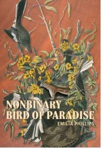 Nonbinary Bird of Paradise shakes its tail feathers, reveling in a body that cannot be contained in gender binaries. Its opening sequence re-imagines the Judaeo-Christian Eve as a queer person who, instead of eating of the proverbial forbidden fruit, conjures a femme lover: “God made man / in his own image, / so they say. / So I made a beloved / in mine,” she says. Eve’s power triggers a jealous God to manipulate Adam toward behaviors of toxic masculinity and to exile the two humans from the Garden of Eden. This retelling, accompanied by other retellings of classical and biblical narratives, indicts the ways in which religion and myth have created and buttressed compulsory heterosexuality. Elsewhere in the collection, Phillips delights in the autobiography of their imagination, the rendering of self after self after self. “Would you stay // & watch me,” Phillips asks in the titular poem, wondering if the beloved will deem them desirable, even though they are masculine without being a man, “even / though / I have no blue velvet / skirt or ruby-raw / throat?”