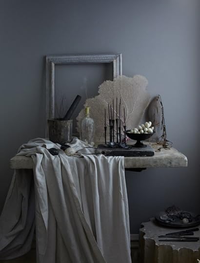 True, this particular book does focus more on arranging (styling, it is called here) objects together on surfaces rather than, say, choosing paint colors to suit your furniture, but it certainly doesn't do anything revolutionary. In fact, it seems fairly limited in scope. Roberston like a narrow palate: blue-gray, off white, black. She likes driftwood and weathered skulls of ungulates, off-white china and clear glass bottles, heavy old jewelry that isn't brightly colored. She displays old brushes and palettes and other art materials in a manner that makes it look as if she used them, although she admits she doesn't (I'm probably over-reading, but this seemed entirely emblematic of the vacuity of possession-styling as a field).