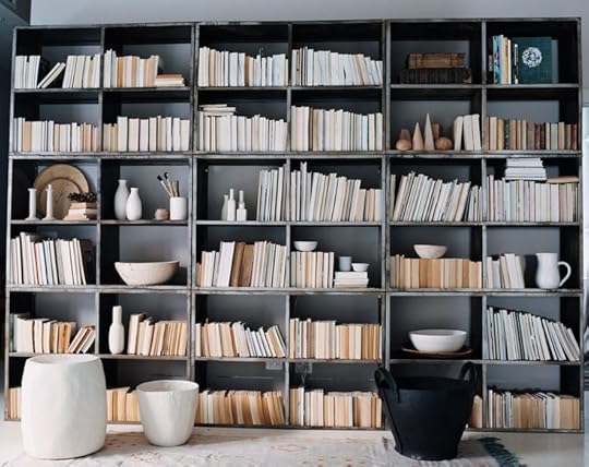 Sometimes I arrange items like this. If I like how they look, I take a photo. Then I put them away again because they are in the way. (Some of the clients mention having children; maybe they have nurseries as well, and nannies to keep them from messing about the house.) I would certainly never put all my books spine-in to create the off-white palate she seems to love.