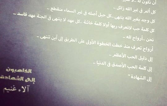 أحضرتها من فترة طويلة ،، من معرض الكتاب .. مع "معالم إلى خوست" قرأت معالم بعد شرائهم مباشرة ،، وأعجبتني وأعجبني أسلوب آلاء غنيم حتى أنني كنت سأقرأ الذاهبون إلى الشهادة فور انتهائي من معالم إلى خوست ،، لكن لسبب ما قررت تأجيلها،، قلت الأفضل أفصل بينهما بكتاب آخر من نوع مختلف ثم أعود لقراءة الذاهبون،،