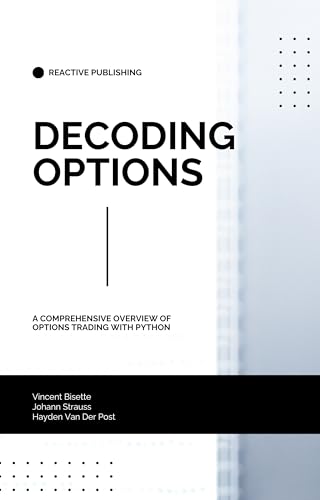 Practical, Hands-On Strategies: Learn through real-world scenarios, practical examples, and step-by-step guides designed to implement sophisticated trading algorithms.Cutting-Edge Techniques: Stay ahead of the curve with insights into the latest technological advancements and quantitative methods in options trading.Python Programming for Traders: Even if you've never written a line of code, our intuitive Python tutorials will guide you through automating your trading strategies, data analysis, and more.Risk Management and Optimization: Discover how to minimize risks and maximize returns with advanced optimization techniques and risk management strategies.Expert Insights: Gain from the wisdom and experience of industry veterans who share their secrets to success in algorithmic options trading.Whether you're aiming to make trading your full-time pursuit or looking to supplement your income through smart investments, "Decoding Options" offers the knowledge and tools to turn the volatile world of options trading into a source of stable returns.