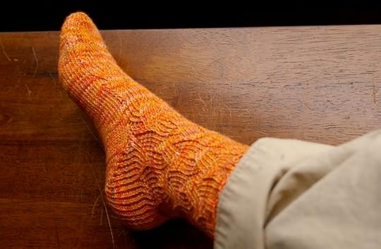 The world has come a long way, and astonishing and intriguing machines arrive every day, but there is still not a machine on this earth that will shear a sheep. Every ball of wool starts with some man or woman somewhere in the world...holding fast to a pissed-off sheep while cutting its fleece free. Every ball of wool you and I have ever knit, all the balls of wool in the world in every country in the whole history of the world thus far, came from the sweat and grit of a person wrestling a hot, dirty, furious sheep.And now that wool is on my (and the Yarn Harlot's) feet. Very cool.