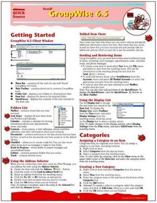 Do you need an easy-to-follow software reference right at your fingertips? Our 6 page, tri-fold guides are the answer. These quick reference guides include step by step instructions to help users to learn software features more quickly, as well as full color screen graphics to highlight important features. Quick Source reference guides also include the software program s NEW features and gives you quick access to time saving shortcuts. The Novell GroupWise 6.5 Quick Source guide is a clear and concise tool for learning the features in GroupWise 6.5. Features contained in this guide include NEW features such as Categories, Using the Address Selector, Adding a Subject to an Item, and Using the Contacts Folder. It also includes Sending and Retrieving Items, Creating a New Category, Creating a New Item, Printing an Item, Creating a New Mail Message, Viewing the Calendar, Creating a Personal Task, Scheduling a Personal Appointment, and much more.