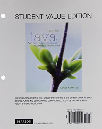 "Java Software Solutions" teaches a foundation of programming techniques to foster well-designed object-oriented software. Heralded for its integration of small and large realistic examples, this worldwide best-selling text emphasizes building solid problem-solving and design skills to write high-quality programs. MyProgrammingLab, Pearson's new online homework and assessment tool, is available with this edition.Subscriptions to MyProgrammingLab are available to purchase online or packaged with your textbook (unique ISBN). Use the following ISBNs to purchase MyProgrammingLab: " Student Value Edition for Java Software Solutions "& MyProgrammingLab with Pearson eText Student access code card for "J"ava Software Solutions "" ISBN: 0132804220 This package contains the" Student Value Edition for Java Software Solutions "textbook, an access card for MyProgrammingLab, and the Pearson eText student access code card for "Java Software Solutions. "Purchase instant access to MyProgrammingLab online.