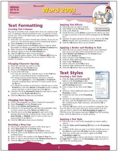 Do you need an easy-to-follow software reference right at your fingertips? Our 6 page, tri-fold guides are the answer. These quick reference guides include step by step instructions to help users to learn software features more quickly, as well as full color screen graphics to highlight important features. Quick Source reference guides also include the software program s NEW features and gives you quick access to time saving shortcuts. The Microsoft Word 2003 Advanced Quick Source guide is a clear and concise tool for learning the advanced features in Word 2003. Features contained in this guide include Creating Text Columns, Applying Text Effects, Creating a Text Style, Using the Picture Toolbar, Ordering Objects, Inserting Columns and Rows, Creating a Chart, Creating a Master Document, Using the Document Map, Inserting a Hyperlink, Inserting a Text Box, Recording a Macro, Applying a Theme, Creating a Password, Customizing a Toolbar, and much more.