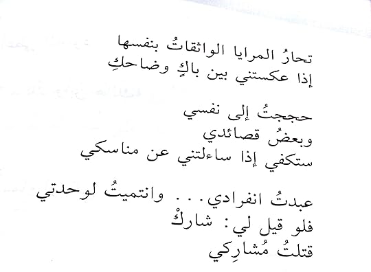 * عرفت محمد عبدالباري كرائد في ملتقى أقرأ, واكتشفت هذا الفيلسوف من خلال إدارته لطاولة نقاش"كتاب كليلة ودمنة" ..أعتبر شغفه بالتراث الإسلامي مصدر إلهام * قرأت الديوان بطريقة[كمبيوتر] كعادتي لا أجتهد في كشف الأسرار, أتجاوز العاطفة والخيال, أقيم المعنى لدرجة قاتلة * في جلسة واحدة-ربع ساعة- انتهيت منه * يصادف في اليوم التالي لقراءة الديوان-وإن كان يعتبرهاالبعض تصفح- أحضر محاضرة عن الشعر يقدمها محمد عبدالباري , بعيداً عن تفاصيل المحاضرة مازلت أحتفظ بتأنيب الضمير عندما قال: في الشعر,قد تستغرق قصيدة واحدة ساعة للقراءة" :( * أعتقد الآن أني أتفهم عالم الشعراء, وأكثر إدراك أن تطفلي على عالمهم هو جلطة لهم :)