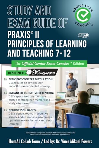 Full and updated Review core concepts of teaching and learning, ensuring a robust understanding of the content assessed in the Praxis II exam.Visual Each chapter commences with visually engaging mind maps, leveraging brain science and learning psychology to enhance memory, comprehension, and engagement.Research-based study Make the most of your study time with Learning Boxes, which stimulate critical thinking, provide concise summaries of key takeaways, and offer inspiration through quotes and study tips.Optimal Navigate complex subjects effortlessly with a streamlined 3-step review, recognition, and recall process that makes studying both manageable and rewarding.Chapter Wrap up each chapter with handy checklists, allowing you to review key concepts and reinforce understanding through active recall and elaboration.Lead the next generation of young minds by becoming an effective educator with the Study and Exam Guide of Praxis II Principles of Learning and Teaching 7-12. With this comprehensive guide and the support of Genius Exam Coaches, you'll be well-prepared to conquer the exam and advance your career in education!