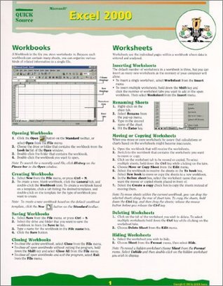 Do you need an easy-to-follow software reference right at your fingertips? Our 6 page, tri-fold guides are the answer. These quick reference guides include step by step instructions to help users to learn software features more quickly, as well as full color screen graphics to highlight important features. Quick Source reference guides also include the software program s NEW features and gives you quick access to time saving shortcuts. The Microsoft Excel 2000 Quick Source guide is a clear and concise tool for learning the features in Excel 2000. Features contained in this guide include Opening Workbooks, Inserting Worksheets, Selecting Rows or Columns, Formatting Cell Contents, Entering Data, Finding Data, Replacing Data, Creating Formulas, Using AutoCalculate, Charts, Data Maps, Selecting Print Options, Using the Office Assistant, and much more.