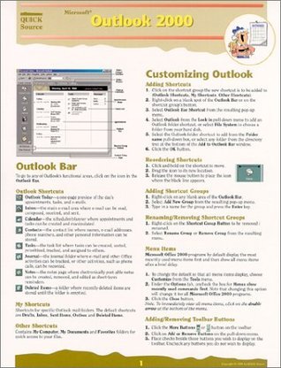 Do you need an easy-to-follow software reference right at your fingertips? Our 6 page, tri-fold guides are the answer. These quick reference guides include step by step instructions to help users to learn software features more quickly, as well as full color screen graphics to highlight important features. Quick Source reference guides also include the software program s NEW features and gives you quick access to time saving shortcuts. The Microsoft Outlook 2000 Quick Source guide is a clear and concise tool for learning the features in Outlook 2000. Features contained in this guide include My Shortcuts, Adding Shortcuts, Composing E-mail, Adding Attachments to E-mail, Filtering Incoming Mail, Changing Outgoing Mail Format, Setting up a Contact, Recording Events, Creating a New Note, Creating a New Appointment, Working with a Task, and much more.