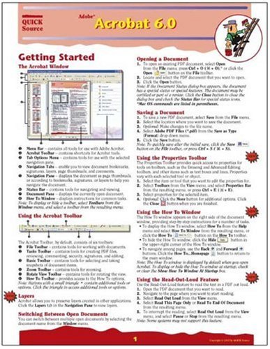 Do you need an easy-to-follow software reference right at your fingertips? Our 6 page, tri-fold guides are the answer. These quick reference guides include step by step instructions to help users to learn software features more quickly, as well as full color screen graphics to highlight important features. Quick Source reference guides also include the software program s NEW features and gives you quick access to time saving shortcuts. The Adobe Acrobat 6.0 Quick Source guide is a clear and concise tool for learning the features in Acrobat 6.0. Features contained in this guide include NEW features such as Using the Properties Toolbar, Using the How To Window, Using the Read-Out-Loud Feature, and Creating a PDF from Multiple Files. It also includes Using the Acrobat Toolbar, Opening a Document, Using the Print Command, Using the Signature Pane, Creating Page Thumbnails, Cropping a Page, Using Text Markup, and much more.