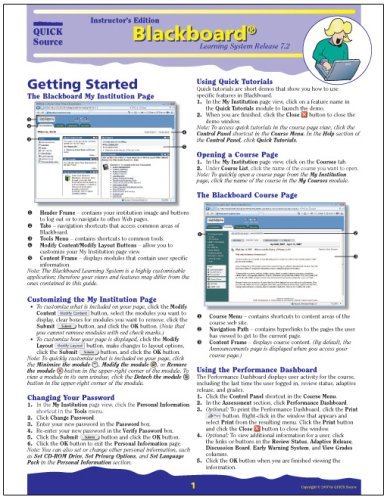 Do you need an easy-to-follow software reference right at your fingertips? Our 6 page, tri-fold guides are the answer. These quick reference guides include step by step instructions to help users to learn software features more quickly, as well as full color screen graphics to highlight important features. Quick Source reference guides also include the software program s NEW features and gives you quick access to time saving shortcuts. The Blackboard Learning System Release 7.2 Quick Source guide is a clear and concise tool for learning the features in Blackboard. Features contained in this guide include Using the Performance Dashboard, Quick Tutorials, Syllabus Builder, and Adaptive Release. It also includes Creating a Folder, Working with Discussion Threads, Creating an Assignment, and much more!