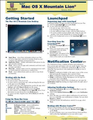 Do you need an easy-to-follow software reference right at your fingertips? Our 6 page, tri-fold guides are the answer. These quick reference guides include step by step instructions to help users to learn software more quickly, as well as full color screen graphics to highlight important features. Quick Source reference guides also include the software program's NEW features and give you quick access to time saving shortcuts. The Mac OS X Mountain Lion Quick Source guide is a clear and concise tool for learning the features in Mountain Lion. Features contained in this guide include tips such Using the Notification Center, Working with Mission Control, Searching from the Launchpad, Sending an Instant Message, Setting a Reminder, Making a List in Notes, Using Gatekeeper Security Features, and much, much more! If you want a Quick Source Guide, but do not see the title you want, visit us at quicksourcelearning.com.