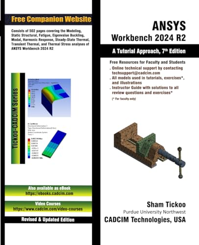 ANSYS Workbench 2024 A Tutorial Approach textbook introduces the readers to ANSYS Workbench 2024, one of the world’s leading, widely distributed, and popular commercial CAE packages. It is used across the globe in various industries such as aerospace, automotive, manufacturing, nuclear, electronics, biomedical, and so on. ANSYS provides simulation solutions that enable designers to simulate design performance. This textbook covers various simulation streams of ANSYS such as Static Structural, Modal, Steady-State, and Transient Thermal analyses. Structured in pedagogical sequence for effective and easy learning, the content in this textbook will help FEA analysts in quickly understanding the capability and usage of tools of ANSYS Workbench.