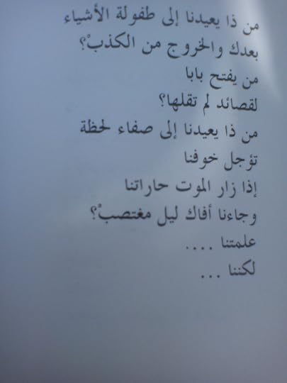 أرى طفولتي تقولها الأشجار لأرى... بعد أن نأيت هذا العمر كومة من الأحجار الشعر وحده أعادني إلى طفولة الأشياء والوقوف ضد الإنهيار الشعر وحده... يعيد للخراب معنى الانتصار.