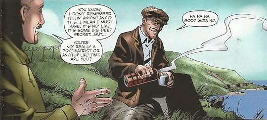 When Hughie gets mad he goes and takes a walk. He meets this English man up there who is a painter, and wanted to capture the sunsets and all of Scotland. They start to bond, since now Hughie has someone he can talk to who is not from the town. How he can vent how he feels at times when his buddies make fun of them. A good growing relationship. We also get stories of the good times as a kid. For example his dad starts fixing up their boat again, and reminds Hughie of being in the bay. He would tell Hughie that Spanish gallons sank there and there is treasure. Hughie would swim down and would somehow find a pound coin every time. He also loves how is mom is baking his favorite things for him.