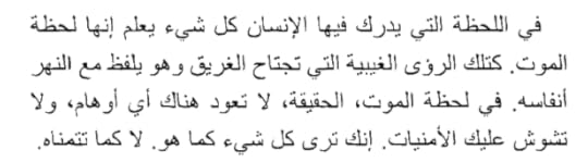 فى اللحظة التى يدرك فيها الإنسان كل شئ يعلم إنها لحظة الموت ، كتلك الرؤى الغيبية التى تجتاح الغريق وهو يلفظ مع النهر أنفاسه . فى لحظة الموت ، الحقيقة ، لاتعود هناك أى أوهام ، ولا تشوش عليك الأمنيات .. إنك ترى كل شئ كما هو ، لا كما تتمناه "