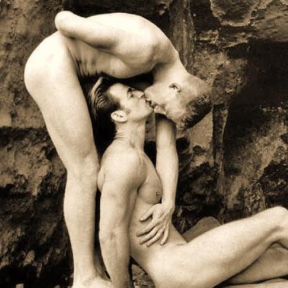 Photo Description: Two young men outside in a secluded location, both naked and totally lost in each other. One sitting and gazing up at his lover who bends down over him for a kiss, his hand lovingly trailing down his chest.