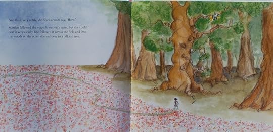 Not quite sure what the real point of the story is -- having or not having a "monster" or not having what all the other kids have. Hmmm. In the story a monster "comes to" or "finds" its child, much like the daemons in Philip Pullman's GOLDEN COMPASS. When Marilyn's monster never arrives she goes looking for it, going (alone) down the winding path through the woods and into a big field with wildflowers and then into the woods on the other side of the field and then climbs a tall tree where her monster got stuck on its way to finding her.