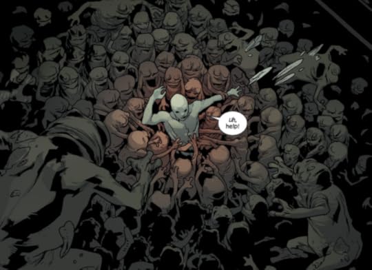 The art through the books is uneven. In the early issues, they are excellent, with the various artists using variations on what I think of as Frank Miller’s 1980s style: a darker palette, the figures blocky and not always perfectly inked. That sounds denigrating, but its not. It makes the characters feel solid, real, but also part of some closely-related-but-not-quite-our-own universe. In later issues, the art can be just off, the expressions on faces not matching the action or the dialogue. There are a few chances for the artists to really stretch their wings and experiment with a lot of different styles, befitting the mix of eras, and these work well. But throughout the books there is a tendency to make the art during the battle scenes abstract, to the point where it is difficult to follow the action. (This is not a Hollywood track to borrow: poorly choreographed action sequences.) The seventh book, fittingly enough, has the worst art, grainy and pallid.