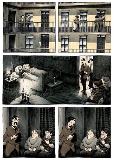 Novela gráfica situada en Francia unos meses antes del comienzo de la 1ª Guerra Mundial. Unos trágicos asesinatos se suceden en el Familisterio de Guisa... quién será el culpable, uno de los familisterianos o alguien totalmente ajeno? Bueno para empezar nos explican que es un familisterio ;) ya aprendí algo jeje, un puntito a favor. La obra es básicamente de suspense, con la investigación de los crímenes por parte de los protagonistas, además tiene tintes de crítica social, ya que trata el tema de la guerra, comunismo vs capitalismo etc. Para mí ha sido una lectura interesante y entretenida, pero se que da un poco corta en esa segunda característica; aunque he de decir que me enganchó lo suficiente como para leerla del tirón, y la trama encaja perfectamente. Podríamos decir también que tiene un punto con Poe por la temática, la manera de narrarlo que se aprecia sobre todo al principio y al final con la carta de la protagonista a una amiga, y también por el ambiente lúgubre del dibujo. Me faltó saber qué fue de uno de los protas en esa carta final... Recomendable.