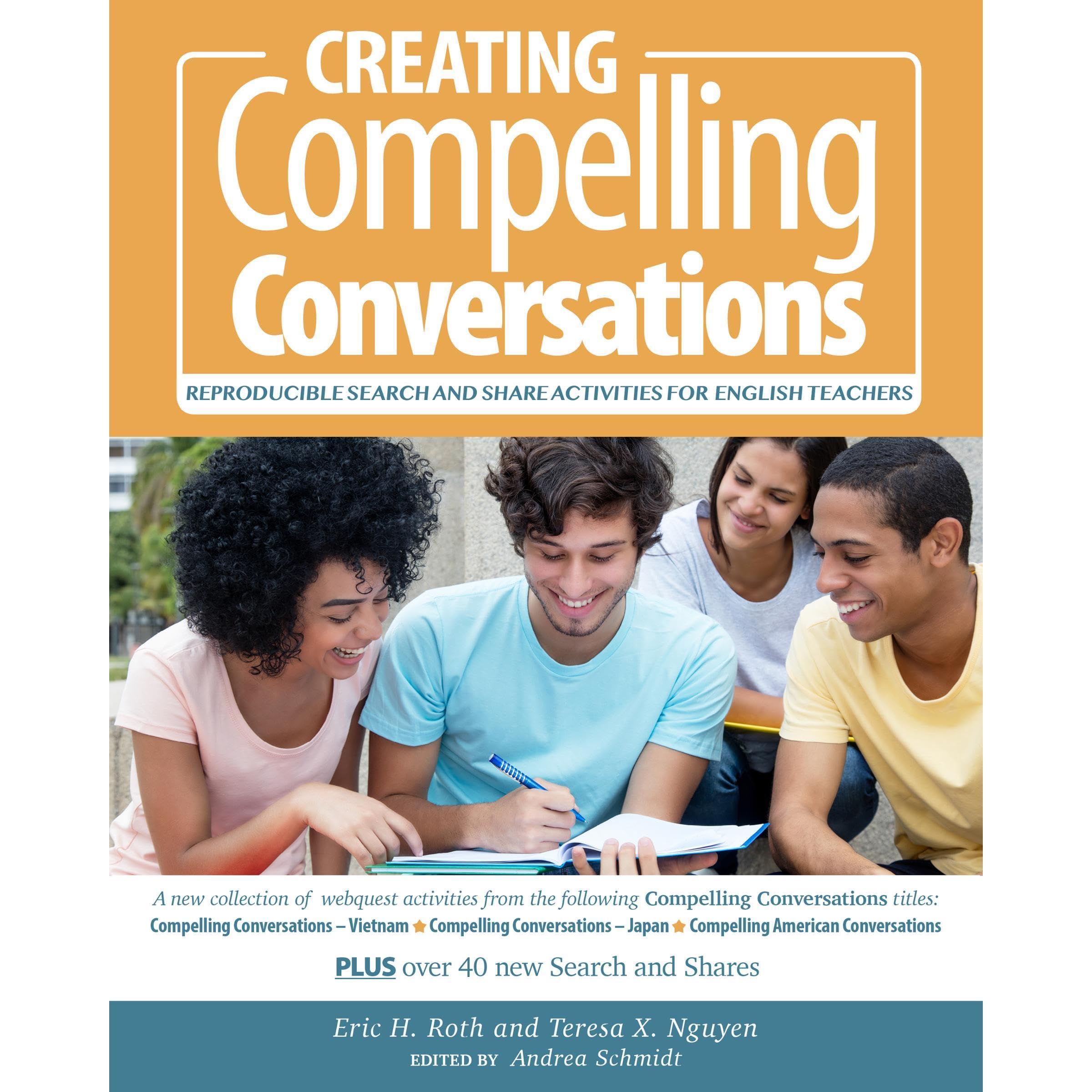 Give your English students a choice and a voice! How can we make each lesson different and engaging? How about letting our English student co-create their assignments! This new collection of reproducible 'Search and Share' activities and worksheets for English teachers gives your students a choice and a voice. Each one-page lesson encourages curiosity, deepens research skills, expands word knowledge, and sparks student discussions. How? We ask our English students to find contemporary sources, summarize information, evaluate evidence, and reflect on their relevant experiences with a conversation partner or in a small group. Students answer sets of 10 questions, cite sources, share information, learn new vocabulary, and express their opinions. The flexible worksheets and activities allow students to expand their working vocabulary in English, deepen critical thinking skills, and even learn some grammar in context of authentic documents. This collection includes the most popular 'Search and Share' activities from ESL/EFL textbook series Compelling Conversations, including Compelling American Conversations and Compelling Conversations - Vietnam. Originally created for community college and international university students, these communicative activities require students to develop essential research skills in small, focused exercises.The book also includes optional, creative and supplemental activities allowing students to create documents such as writing Yelp reviews, memos, and tourist brochures to recorded newscasts, movie reviews, and mock Skype interviews. Almost all the Search and Shares can be used as springboards for a wide range of oral presentations and/or short writing tasks. Students and English teachers have an impressive range of creative assignments based on student research. The book Studying EnglishUnit Preparing for American College LifeUnit Creating a HomeUnit Modern LivingUnit Exploring New Career OpportunitiesUnit Enjoying and Keeping MoneyUnit Traveling Around the Big WorldUnit Enjoying Free TimeThe appendix also includes student survey forms and teacher, peer, and self-evaluation forms for student presentations. Recommendations for websites and educational apps are also included. The communicative assignments also provide English students practice in citing, writing, and speaking on personal interests, academic topics, and workplace skills. Based on the extensive teaching experiences of professors Eric H. Roth and Teresa X. Nguyen with both international graduate students and community college classes, 'Creating Compelling Conversations' focuses on the essential communication skills required for academic success in American universities. Many other experienced ESL/EFL teachers and English tutors also contributed activities and ideas including Toni Aberson, Hal Bogotch, Trinity Bustria, Shiggy Ichinomiya, Yuka Kuroda, Andrea Schmidt, Tuanni B. Vasconcelos, and Brent Warner. Intermediate to advanced English students in high schools, intensive English programs (IEP), community college classes, adult education centers, and vocational programs will find these communicative activities appealing and useful. These single- page reproducible worksheets help hectic English teachers create lively classroom conversations. English teachers can also use the creative extension activities to have students give presentations, record videos, make collages, write memos, develop marketing plans, create Venn diagrams and pen persuasive essays.What will your students find and learn? How will you use these Search and Share materials? What compelling conversations will you have in your English classes?