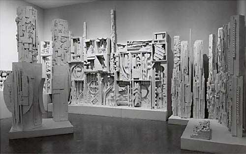 A lovely book with its sumptuous illustrations and extended personal insights and memories of the artist based on interviews. I share a lot of reactions to this 1979 book because it has only had 20 ratings and 5 reviews on Goodreads. But first let me just show you a couple of her works so you can recall her type of genius. If you’ve seen her work, you probably have experienced one of her intricate constructions of wooden forms or one her larger abstract sculptures. Her wooden compositions tended to be painted monotones of black, white, or gold. Here is one of her white ones, which is actually a small part of her room-sized, semi-architectural composition: