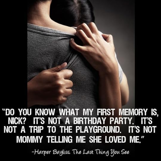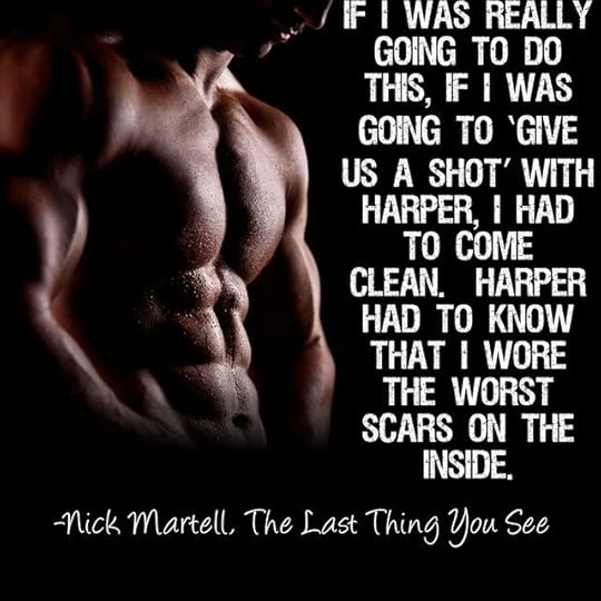 I didn't know where I was, I didn't know if anyone thought I was alive.. But I did know was that I was going to die here This book wrecked my pitiful heart! Harper Bayliss is a celebrity and Nick Martell jumped in front of her and saved her from being covered in acid by her stalker which caused Harper to want to visit Nick at the hospital. Nick wasn’t the average prince charming, he was prince charming covered in scars. Nick was a former Marine who was tortured within inches of his life. These two characters fit together so perfectly. Harper loved Nick purely and never judged his past, his scars and his profession. There are a lot of really emotional scenes in this book I would hate to ruin for you. Our story ends with Harper and Nick fighting to stay alive to be with eachother. Because the last thing they saw was eachother ..