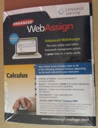 Access codes need to be entered exactly as they appear and are case-sensitive. When purchasing this printed access card for Calculus, ensure that you are using it in a Calculus course. Use with a different course may cause complications with access. Exclusively from Cengage Learning, Enhanced WebAssign combines exceptional mathematics content with the most powerful online homework solution, WebAssign. Enhanced WebAssign engages students with immediate feedback, rich tutorial content, and an interactive, fully customizable eBook, Cengage YouBook helping students to develop a deeper conceptual understanding of their subject matter. This access code includes access to Enhanced WebAssign and life-of-edition access to the eBook for the registered edition of that text. If your students need to retake the course and you are using the same book AND edition then they will not need to buy a new code. If you are not certain this is the correct access code for your course, please contact your Cengage Learning Consultant.