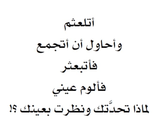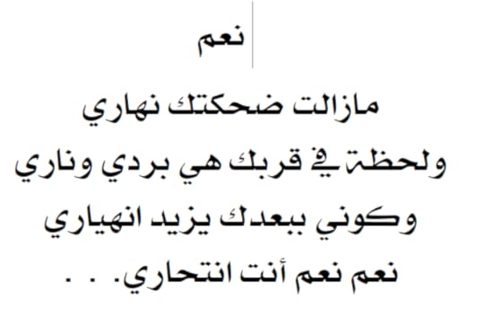 أولا وقبل أن أشرع في إفراغ شحناتي في هذه المراجعة أرغب في الإشارة إلى أنني لم أقرأ هذا العبث إلا رغبة في النقد ولأجنب أصدقائي ممن سيرون المراجعة قراءة هذا اللاأدري ما هو. بم أبدأ؟ بالألف المقصورة المستبدلة بالياء؟ أم بجهل الكاتبة أن في كلمة شيء الهمزة تأتي على السطر؟ أم بالحب المتدفق الحلزوني؟ أم بالاستعارات البليدة؟ أم باتهام الكاتبة لنساء الدنيا بتمني حبيبها؟ من قال لك أنني أتمناه يا أخت العرب؟ كنت قد شرعت في الاقتباس لأريكم بعض الذي ينتظركم إن أنتم قررتم قراءة الكتاب، لكن الأيام عيد ولا يليق مشاركة هذا الكلام الفارغ. أود فقط تمرير رسالة إلى الكاتبة، رجاء، احتفظي بكتاباتك على صفحة فيسبوك أو على مذكرة، لا تنشروا هذا العبث.