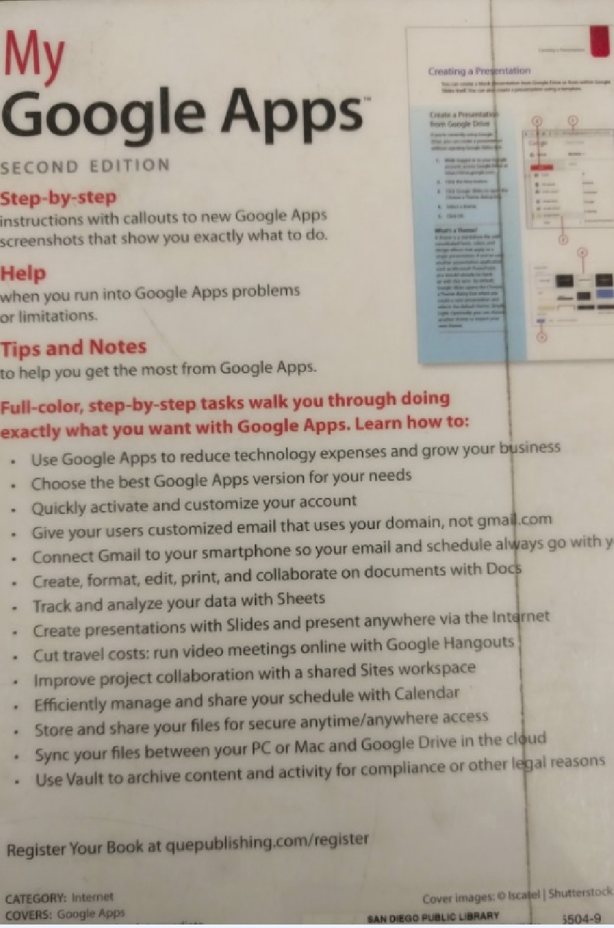 My Google Apps Full-color, step-by-step tasks walk you through doing exactly what you want with Google Apps. Learn how Gmail, Calendar, Drive, Docs, Sheets, Slides, Hangouts, Sites, Vault Step-by-step instructions with callouts to new Google Apps screenshots that show you exactly what to do. Help when you run into Google Apps problems or limitations. Tips and Notes to help you get the most from Google Apps.
