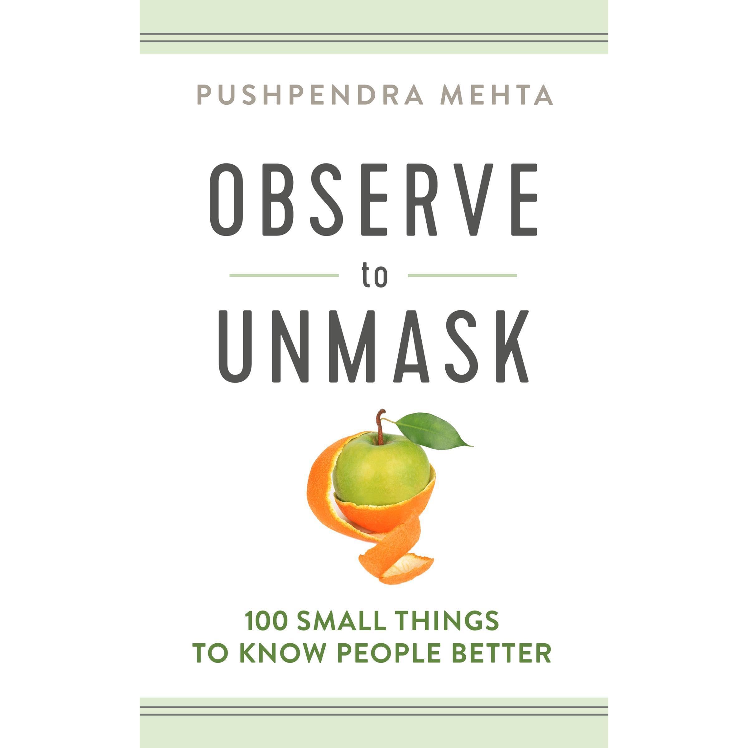 Observe to Unmask: 100 Small Things to Know People Better by Pushgendra Mehta is a powerful perspective on identifying the masks that people wear. Specific chapter titles pursue the mask wearing of those who gossip, giving and taking advice, ego reveals, attention seeking and paying attention.