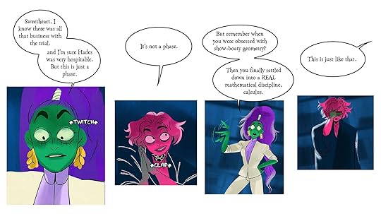 and we also get to see so much backstory from other characters within this volume. like, i really was shedding some tears over minthe! and i think that really speaks to this author being such a good story teller. and a reminder that i am still (and forever) obsessed with daphne. and lastly, we love a timely and educational katabasis word drop moment! lol >.<
