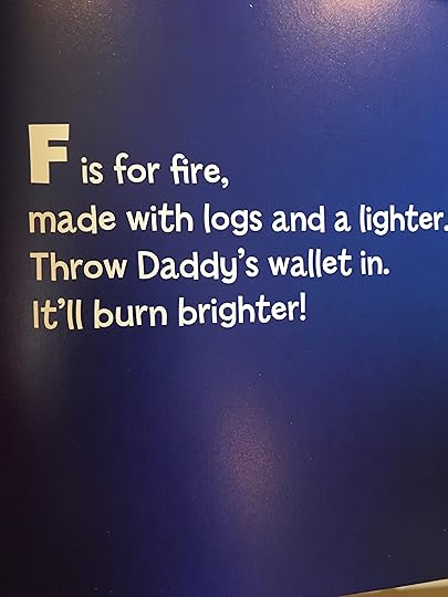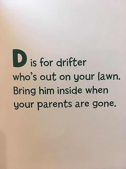 This is a highly inappropriate alphabet book that seems to derive all its humor by telling 'kids' to do horrible things, like take in a drifter or write on the walls of their school. I appreciated some of the humor, particularly when the drifter pops back up wearing moms blouse long after we've gotten past the letter D, but the gimmick gets old fast. Considering how not for children it is, most of it is pretty childish humor.