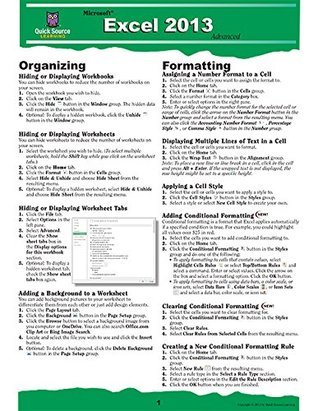 Do you need an easy-to-follow software reference right at your fingertips? Our 6 page, tri-fold guides are the answer. These quick reference guides include step by step instructions to help users to learn software features more quickly, as well as full color screen graphics to highlight important features. Quick Source reference guides also include the software program s NEW features and gives you quick access to time saving shortcuts. The Excel 2013 Advanced Quick Source guide is a clear and concise tool for learning the features in Excel. This guide include tips and instructions on many topics, including Adding Conditional Formatting, Clearing Conditional Formatting, Creating a Drop-Down List, Converting Text Data to Column Data, Changing a PivotTable Design, Creating a PivotChart, Running a Macro and Using Dates as Values. It also includes Creating a Custom Fill Series, Working with Data Connections, Editing an Array Formula and Marking a Workbook as Final!