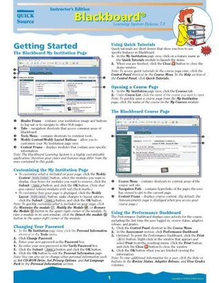 This 6 page, tri-fold, full-color, guide is an invaluable resource for instructors and administrators who use Blackboard Learning System Release 7.0! In a clear, user-friendly format, it provides step-by-step instructions, short cuts and tips on how to execute the basic commands of the software, as well as pointing out the NEW features of this version. Topics Customizing the Course Menu, the Course Menu Design, and the “My Institution Page”; Changing Your Password; Opening a Course Page; Using Quick Tutorials and the Performance Dashboard; Adding, Copying, Moving, and Editing Course Content; Using the Syllabus Builder and Adaptive Release; Enabling Review Status; Creating an Announcement, a Calendar Event, a Glossary, a Task, a Test, a Forum, and a Discussion Thread; Sending E-mail; Creating a Collaboration Session; Working with the Gradebook; Enrolling and Removing Users from a Course; Exporting and Importing Course Information; and much more! An excellent instructional tool for the user new to Blackboard Learning System Release 7.0, it also serves as a handy reference for the more experienced user.