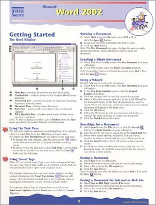 Do you need an easy-to-follow software reference right at your fingertips? Our 6 page, tri-fold guides are the answer. These quick reference guides include step by step instructions to help users to learn software features more quickly, as well as full color screen graphics to highlight important features. Quick Source reference guides also include the software program s NEW features and gives you quick access to time saving shortcuts. The Microsoft Word 2002 Quick Source guide is a clear and concise tool for learning the features in Word 2002. Features contained in this guide include NEW features such as Using the Task Pane, Using Smart Tags, and Using the Styles and Formatting Task Pane. It also includes Opening a Document, Searching for a Document, Selecting Paper Size, Using Click and Type, Selecting Text, Aligning Text, Checking Spelling and Grammar, Tracking Document Changes, and much more.