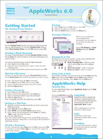 This 6 page, tri-fold full color guide is an invaluable resource for anyone who uses AppleWorks 6.0. It provides step-by-step instructions on how to utilize the various software programs. The user is taught how to create, open, save, close, and print a document. The word processor section explains how select, cut, copy, paste, delete, format, and align text; create outlines and tables; and utilize spell check. The spreadsheet section shows how select cells; navigate between cells; enter data; insert and resize rows and columns; use formulas and functions; sort; format text; and create charts. The database section teaches how define fields; enter data; add and delete records; navigate; sort records; and create reports. There are also sections on how to use the draw, paint, presentation, and clippings features, and much more! An excellent instructional tool for a user new to AppleWorks 6.0, it also serves as a handy reference tool for the more experienced user.