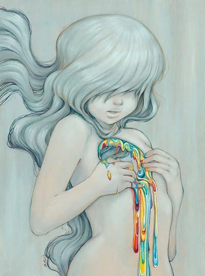 The author comes across as serious about her work, but friendly enough to reach out to give advice. Her art is part of the pop surrealism movement. The subjects are mostly young girls with big, bright eyes. They have paint dripping down off of them, or birds in their hair or tentacles. Her technique is very good, and her advice to be patient and be your own person is welcome.